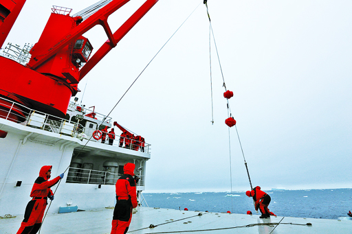 有了上午成功回收海底地震儀的經驗,潛標的回收作業十分順利。下午14時45分,高立寶、劉炎光、邢豪和許浩4名考察隊員乘坐橡皮艇到海上測距。15時,開始釋放潛標。20分鐘后,潛標頂部的浮球露出海面。橡皮艇將潛標拖至“雪龍”船邊。盡管天空飄著雪花、海面刮起四五級風,但在十余名考察隊員的通力合作下,16時20分,長達1000多米的錨系全部被收回船上。