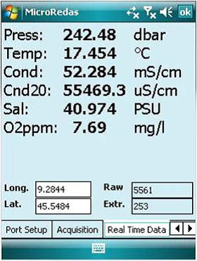 便攜式數據讀取裝置通過內置的RS232C接口與OCEAN SEVEN 3XX CTD連接,并且專門開發了用于Windows Mobile?操作系統的軟件:ZTERM和μREDAS。這些軟件允許使用者直接對CTD進行各種操作,如傳感器校準,實時數據采集,配置等。