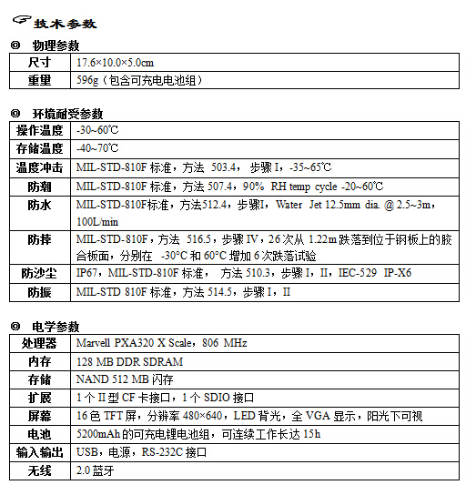 便攜式數據讀取裝置重596g,抗振及耐高、低溫標準符合軍用技術規范。內置一塊5200mAh的電池組,可連續工作長達15h。集成了RS232C接口和USB端口。插槽防風、雨以及灰塵。支持藍牙,無線局域網,GPS卡。